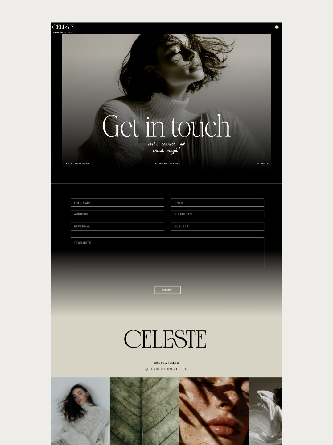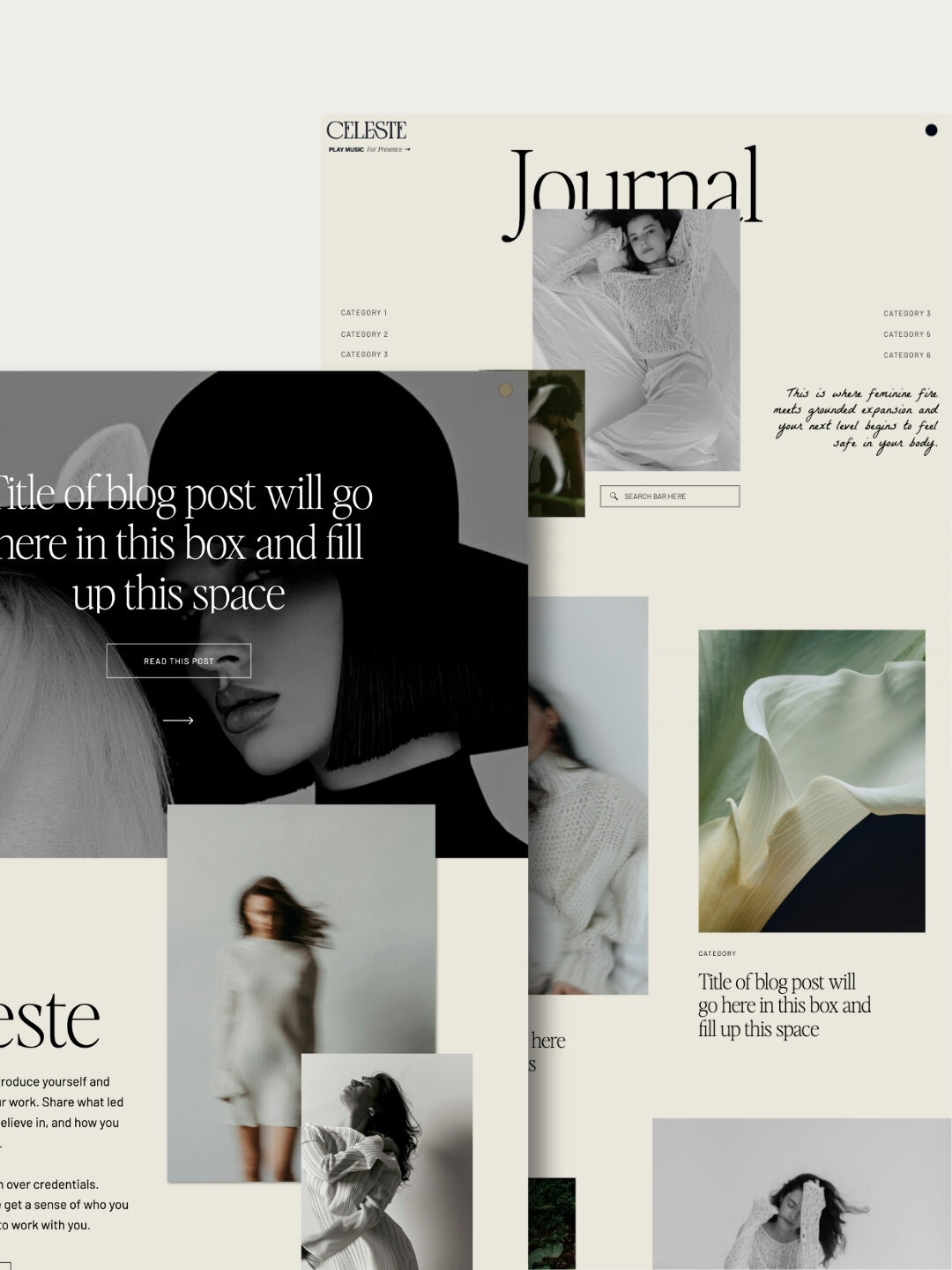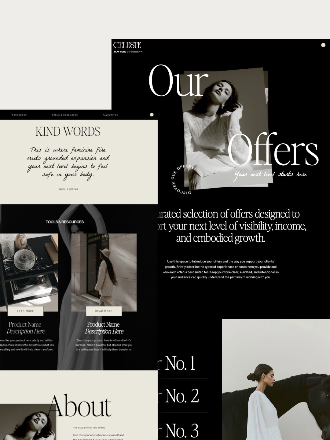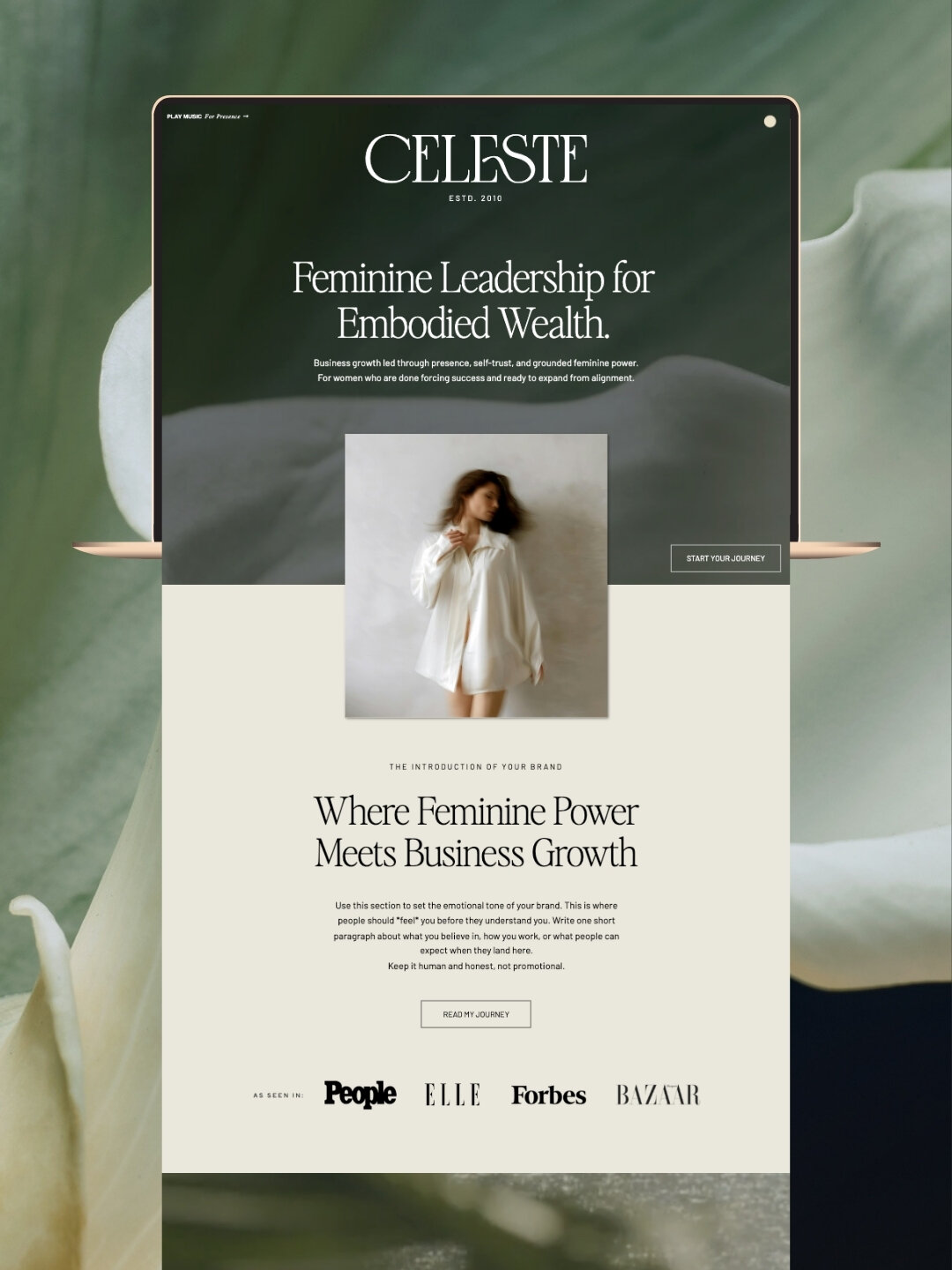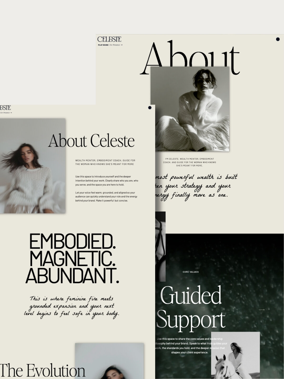 Elegant. Magnetic. Soft. Iconic. This is Celeste. Designed for brands that want their website to feel like more than just a template, Celeste blends editorial elegance with intuitive structure to create a presence that feels elevated and effortless. Every section was thoughtfully crafted to guide visitors through your story while making your brand feel refined, expressive, and unmistakably yours.